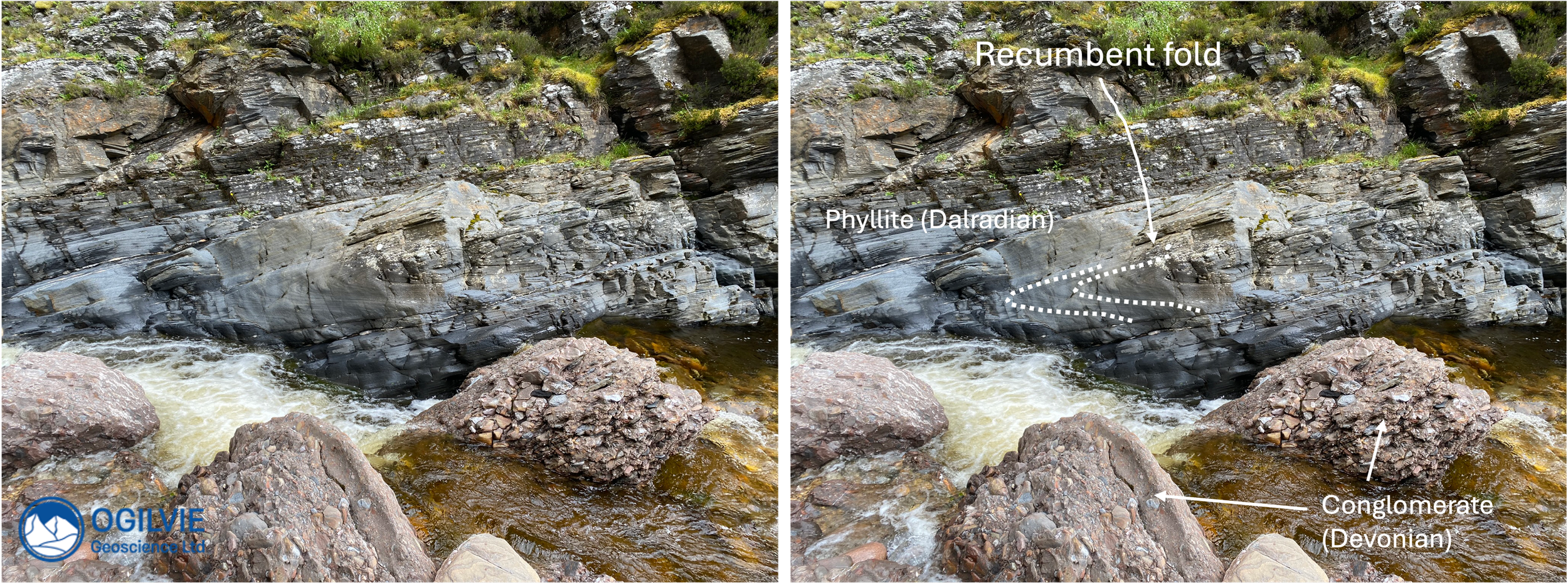 Here’s more views of the gorge showing the dipping Devonian conglomerates on the left and Dalradian metamorphic rocks on the right.