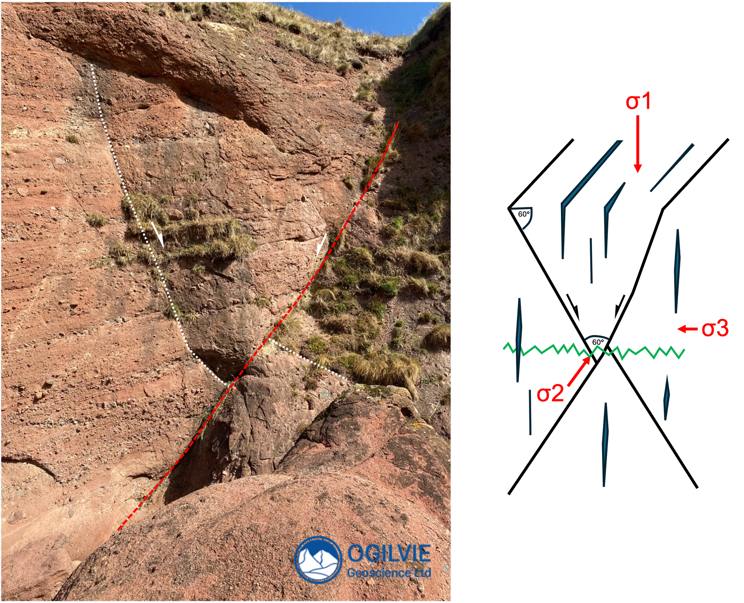 Facing East along a zone of conjugate faults in outcrop (Hopeman Sandstone, UK). Note compound zone of deformation bands (dashed line) in the foreground. Anderson’s model shown on the right.