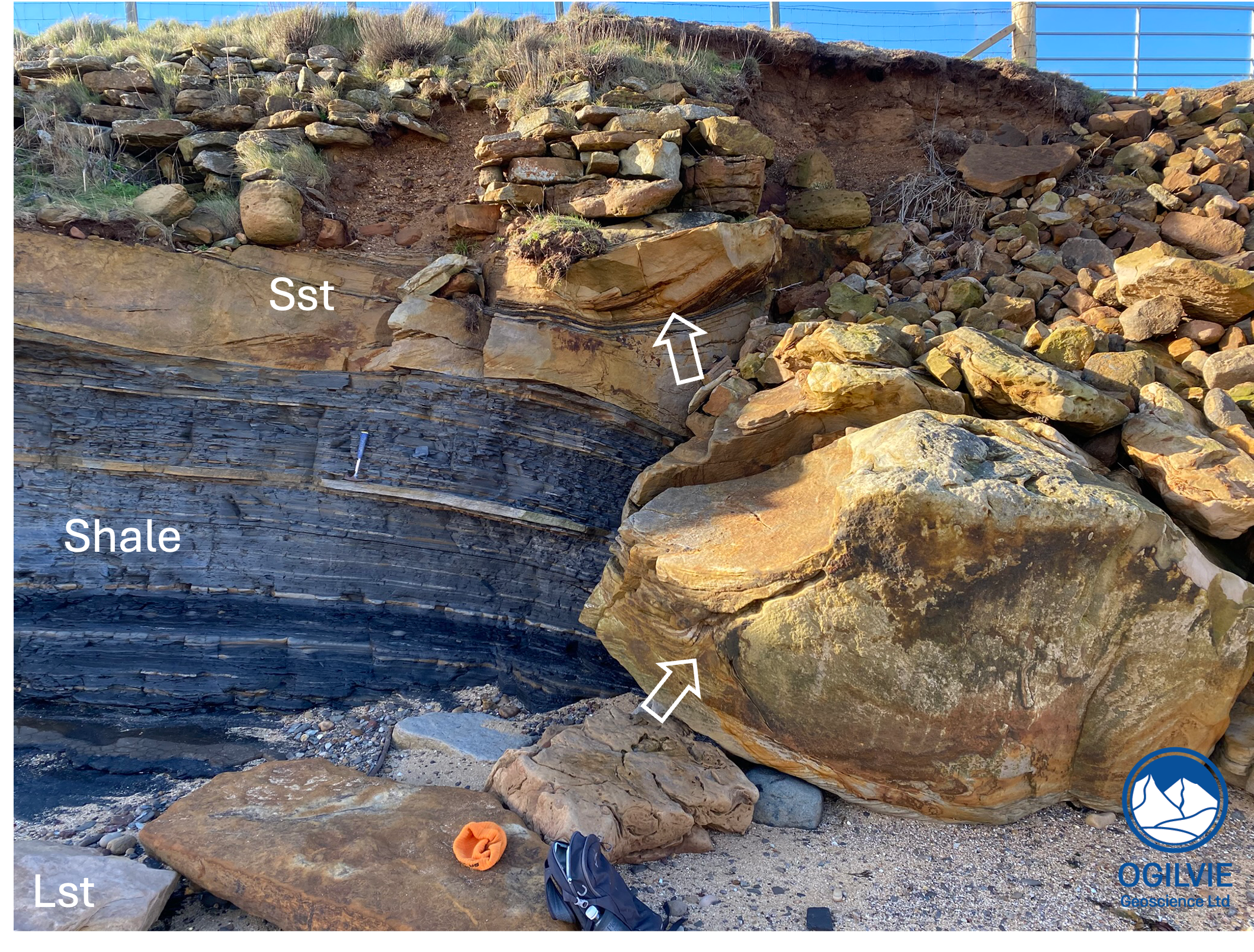 The sandstone at the top of this succession has many folds and contortions. The block on the right has collapsed and fallen downwards.