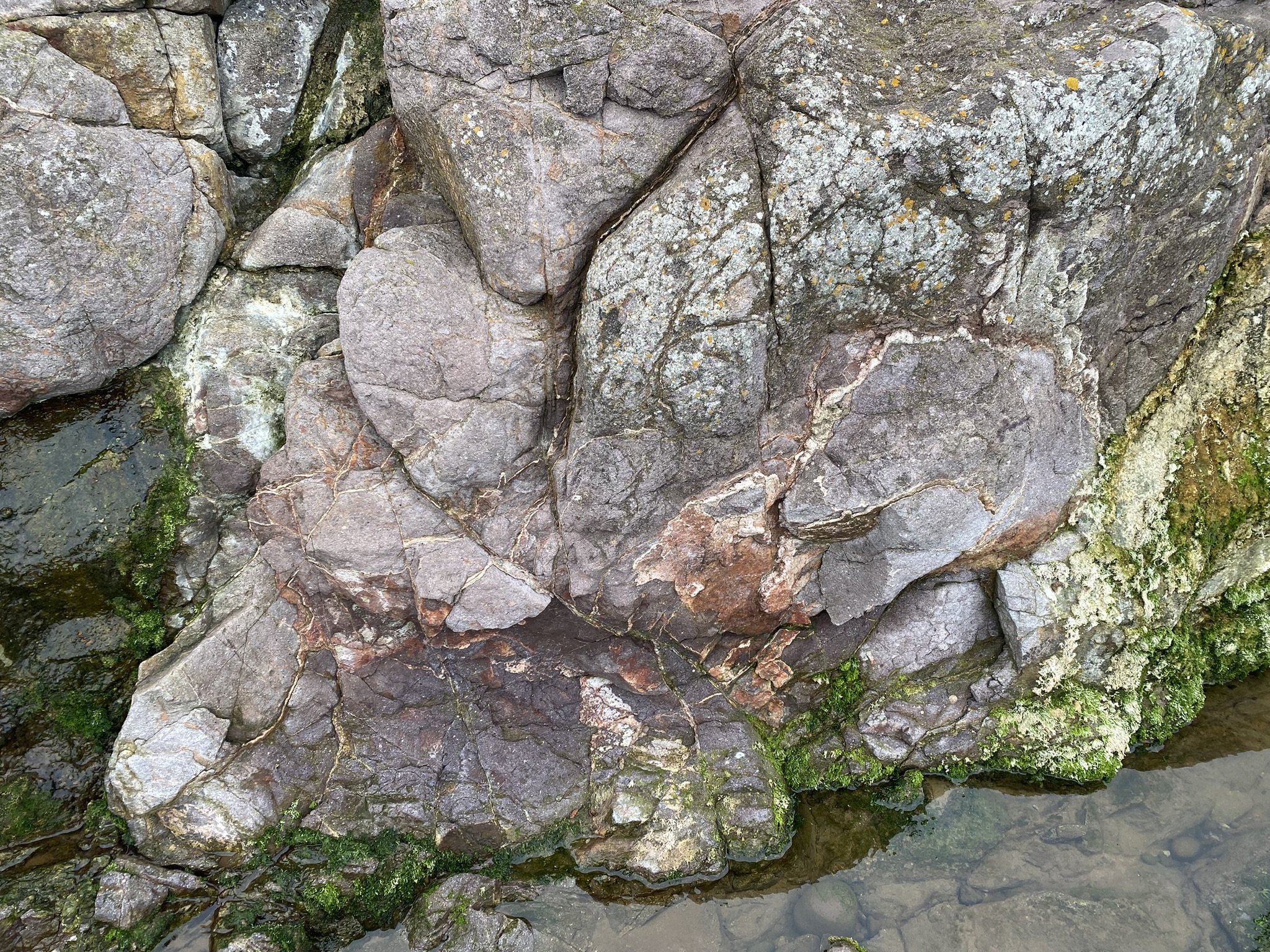 The cliffs in this area are mainly lavas from the Montrose volcanic formation which extend southward to the north point of Lunan Bay. These are also from the Devonian period. It is possible to get up close to these lavas on the north side of Boddin point, close to the coastline. Here, the lavas are faulted against the sediments of the Kinnesswood Formation. The view below shows some polygonal (sometimes called cooling joints) that have formed in the lava.