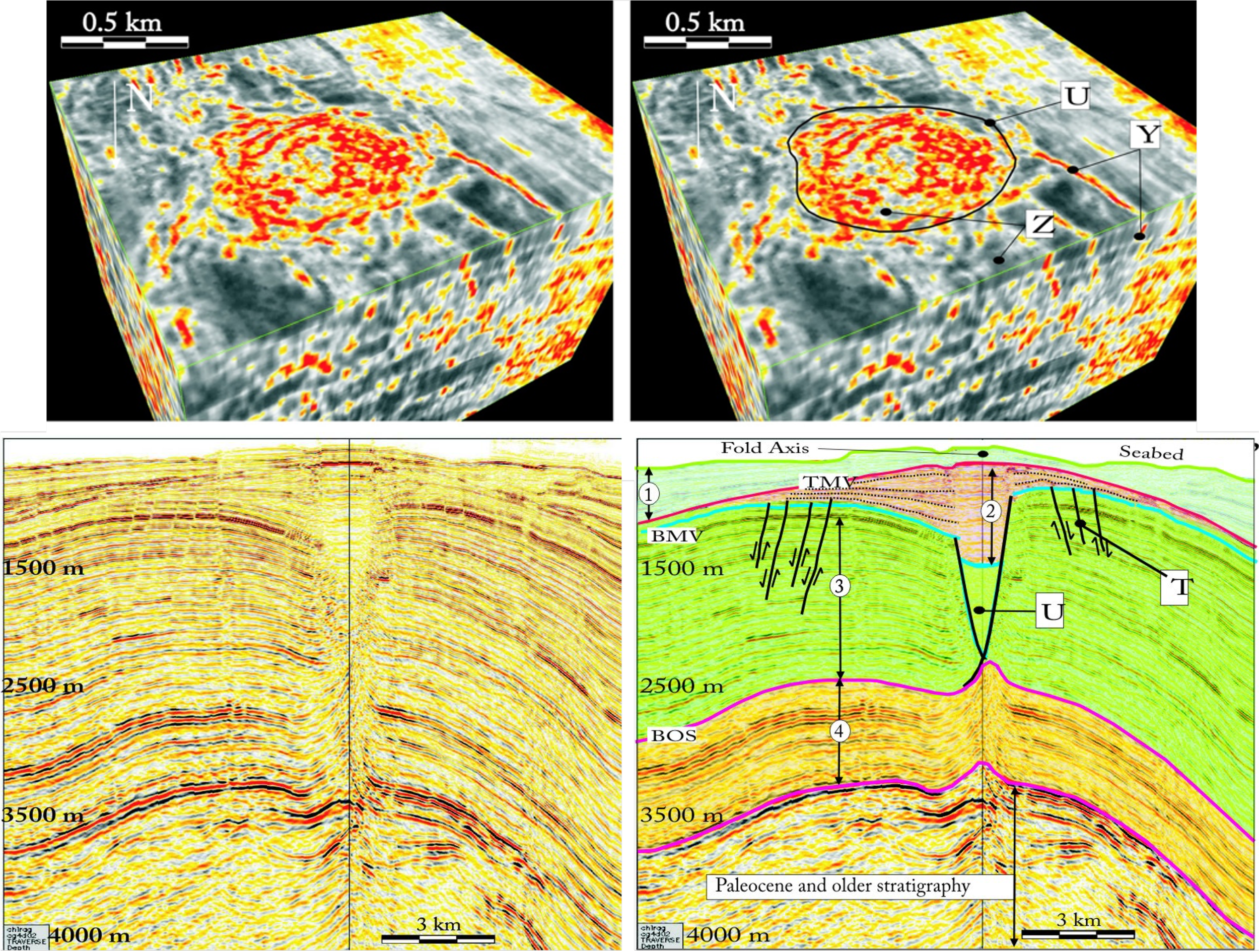 Lower: Section through a Mud Volcano in South Caspian Basin (b) Interpretation. Depositional units 1 – 4. Concentric normal faults (T), downward tapering cone (U); top of the mud volcano surface (TMV); note onlapping sediments at sides. Base of the mud volcano surface (BMV); base of the overburden surface (BOS).