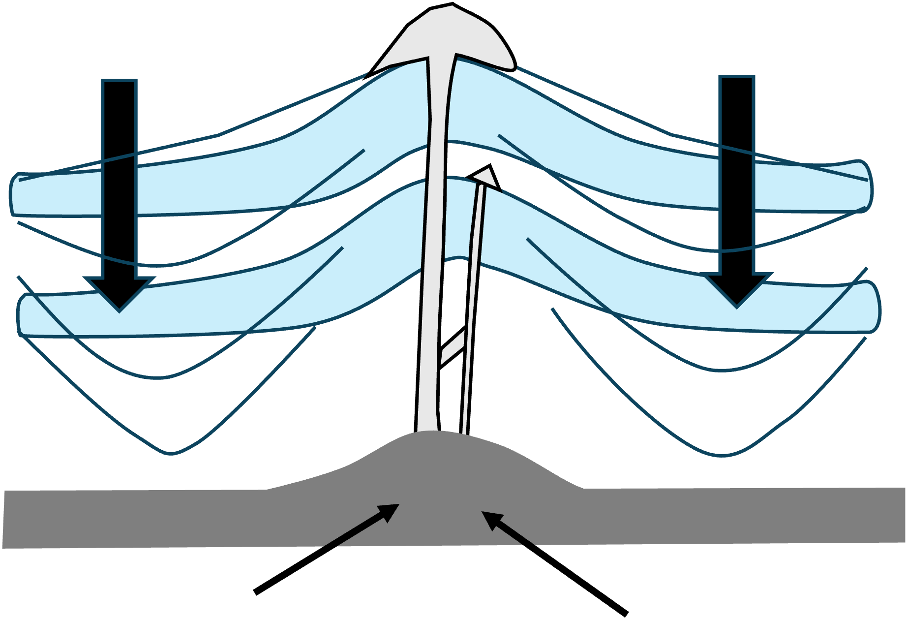 Genesis of mud volcanoes. Blue layers are reservoirs and the grey is the source rock shale which rises through pipes to the surface, forming a cone.