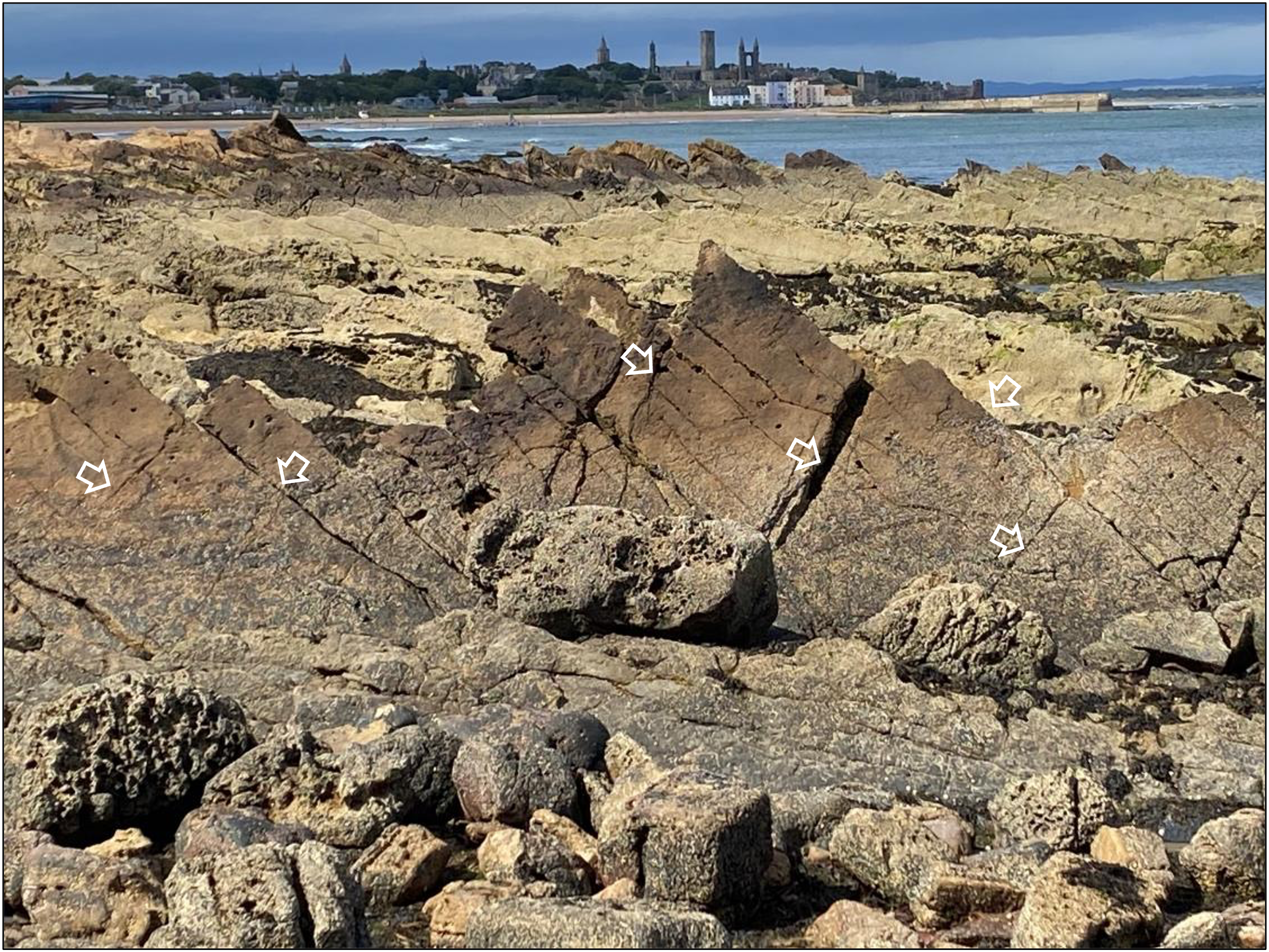 Opposite the white arrows point to some shear fractures in steep sandstone beds of a fold to the East of the town of St Andrews in Fife. The folds have been created during the Variscan Orogeny by faulting and then the shear fractures created during folding.